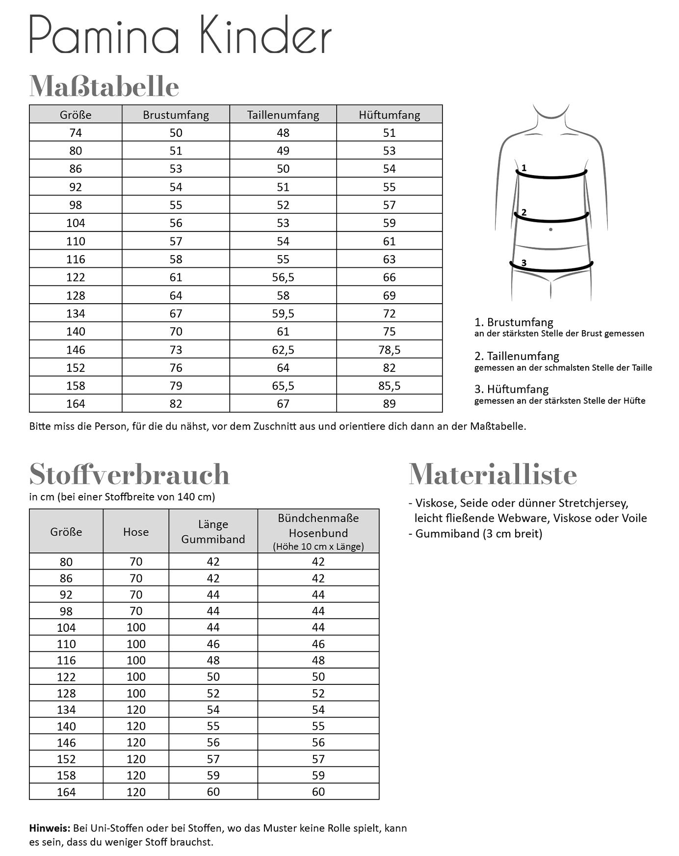 Die Hose Pamina kann aus verschiedenen Stoffen genäht werden. Besonders gut eignen sich Viskose, Seide oder dünner Stretchjersey, leicht fließende Webware, Viskose oder Voile.