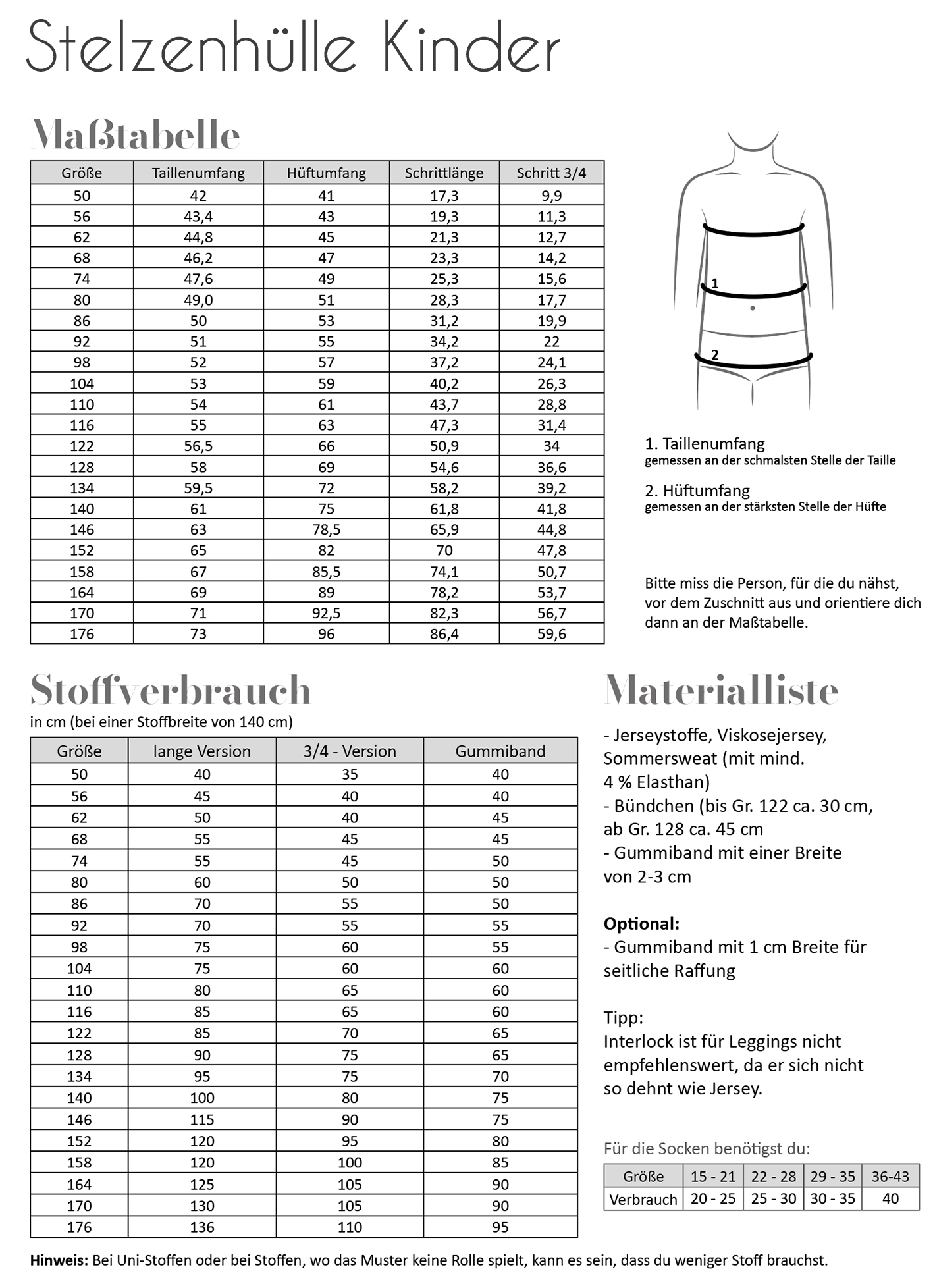 Dieses Papierschnittmuster beinhaltet die Anleitung und die Schnittteile um eine Leggings oder Socken zu nähen.