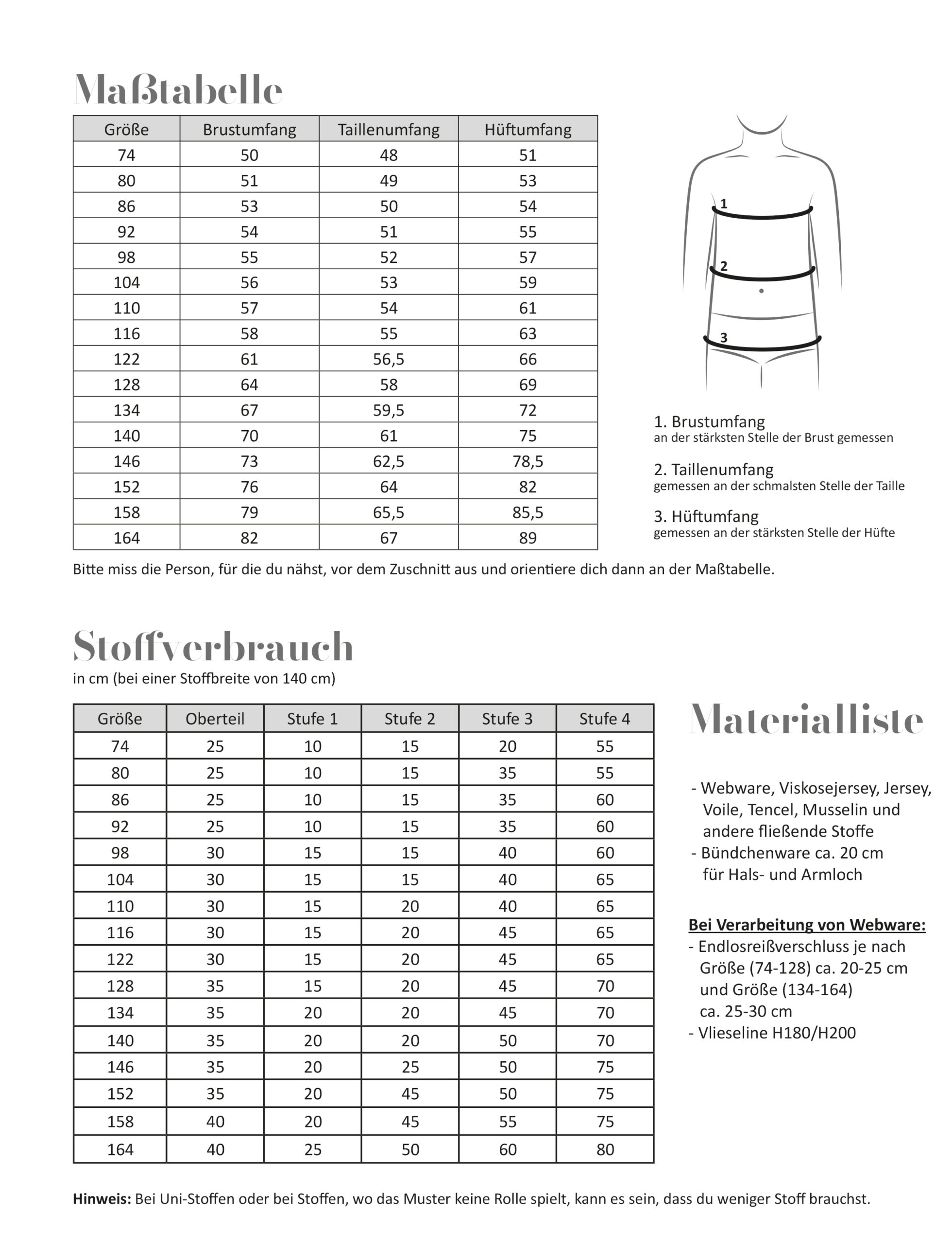 Fiona ist ein leichtes Sommerkleid, das luftig deine Beine umspielt. Du entscheidest selbst, ob du dein neues Lieblingskleid bodenlang nähen möchtest oder ob es über dem Knie enden soll. Als Material eignen sich sowohl elastische als auch unelastische Stoffe.
