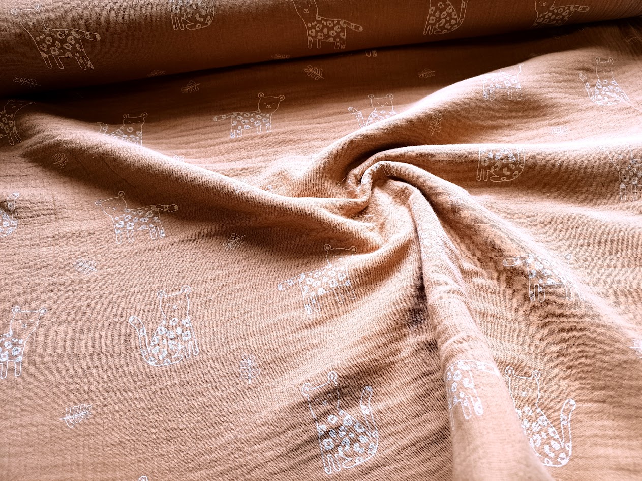 Musselin (Double Gauze) mit kleinen Panthern auf lachsfarbenem, durchgefärbtem Grundstoff.