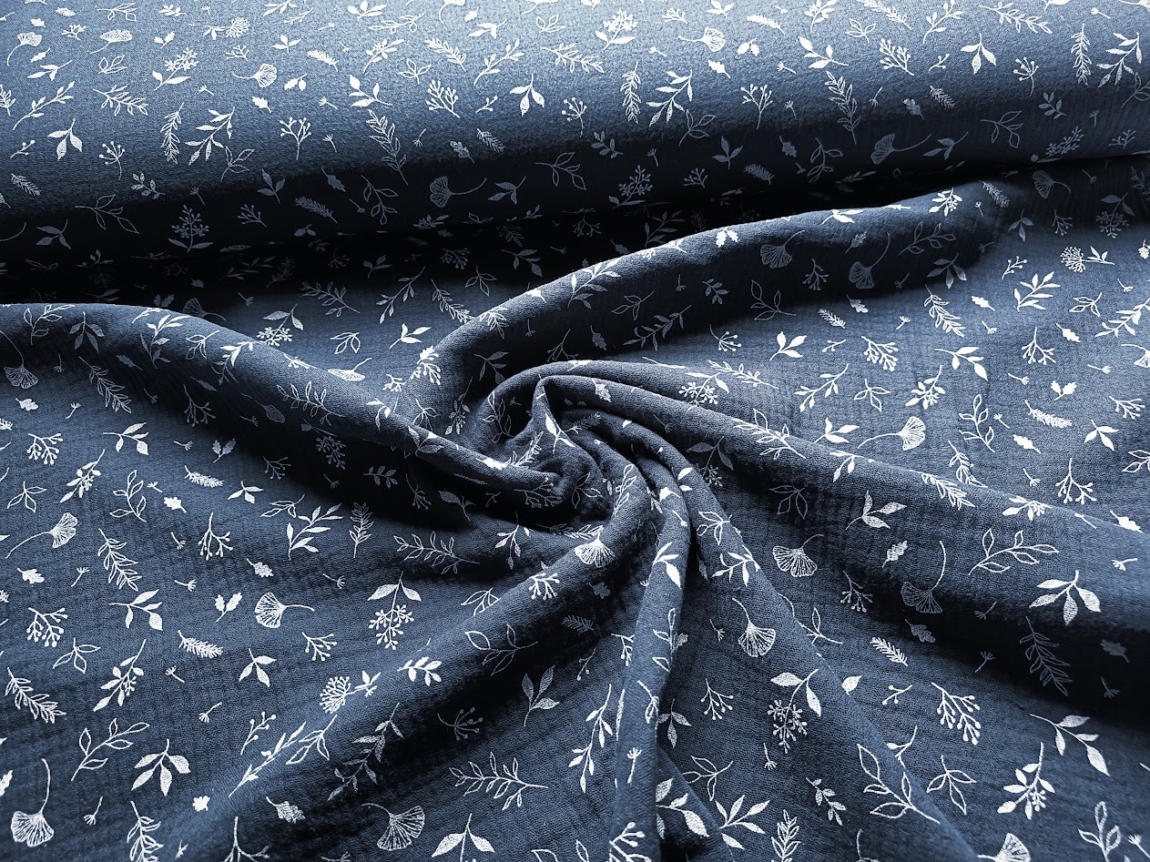 Musselin (Double Gauze) mit Ginko und vielen anderen Blättern auf marinefarbenem, durchgefärbtem Grundstoff.