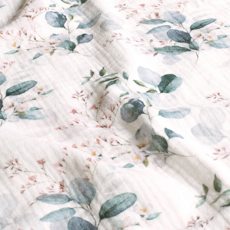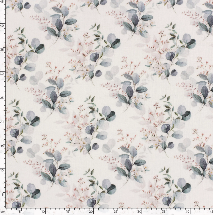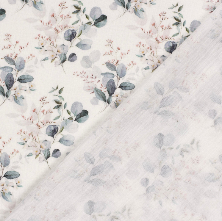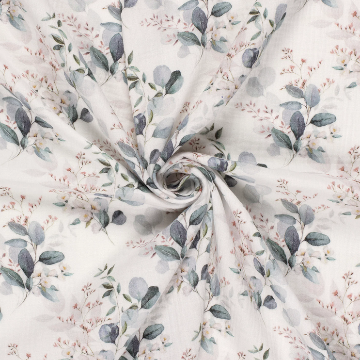 Feiner Musselin (Double Gauze) mit Blättern (Digitaldruck)